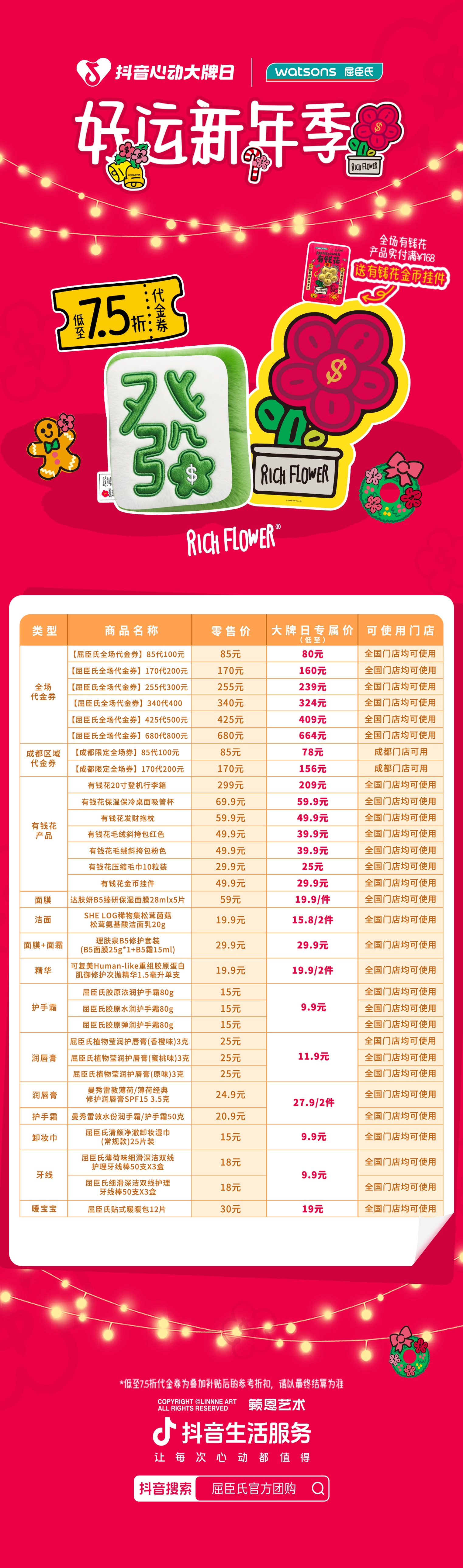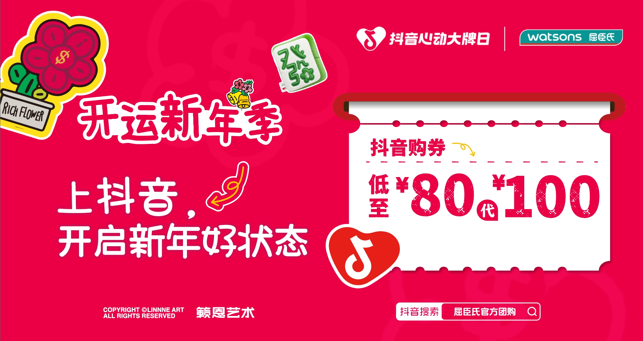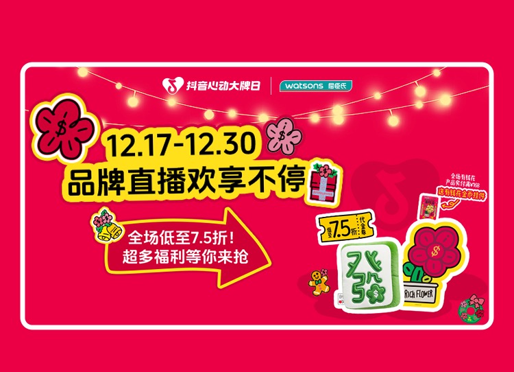 岁末年初是礼赠与自我犒赏的消费高峰,如何精准切入用户情感诉求,并实现从线上引爆到线下转化的无缝衔接?近日,屈臣氏与「抖音心动大牌日」的深度合作给出了自己的答案。12月17日至12月30日,紧扣“新年开运”情感节点,联名潮流IP“RICHFLOWER有钱花”构建强视觉符号,重磅打造“好运新年季”主题活动!并持续深化 “线上内容种草+直播囤券引流+线下千家门店安心核销” 的全链路模式。这不仅是节日营销的精准一击,更是平台与品牌共同探索零售行业线上线下融合增长,强化消费者 “确定性”和“安全感” 购物心智的深入实践。